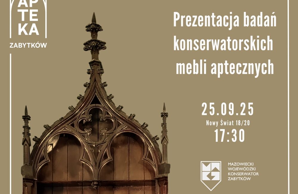 25 września zapraszamy na kolejne spotkanie z cyklu Apteka Zabytków. Okazją do spotkania będzie 180. rocznica urodzin Michała Mutniańskiego – właściciela apteki przy ul. Nowy Świat 18. Podczas spotkania przedstawimy zakres prac oraz wyniki badań konserwatorskich zabytkowego zespołu XIX w. mebli neogotyckich, przeprowadzonych przez zespół Wydziału Konserwacji i Restauracji Dzieł Sztuki Akademii Sztuk Pięknych w Warszawie. Spotkanie odbędzie się w siedzibie Wojewódzkiego Urzędu Ochrony Zabytków w Warszawie, ul. Nowy Świat 18/20, w dniu 25 września 2025 r. o godz. 17.30. Wstęp wolny.